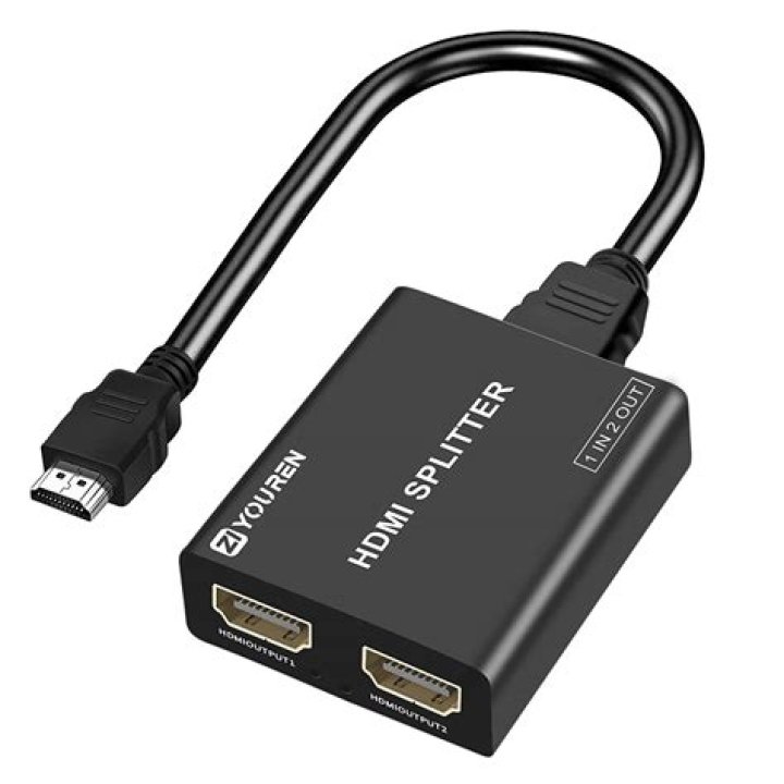 An HDMI splitter takes a signal from one source (like your gaming console, computer, AppleTV, etc.) and sends it to multiple destinations (like TVs or monitors). It’s what you use if you want to, say, play Call of Duty with your roommate on different TVs. Splitters are labeled with two numbers.